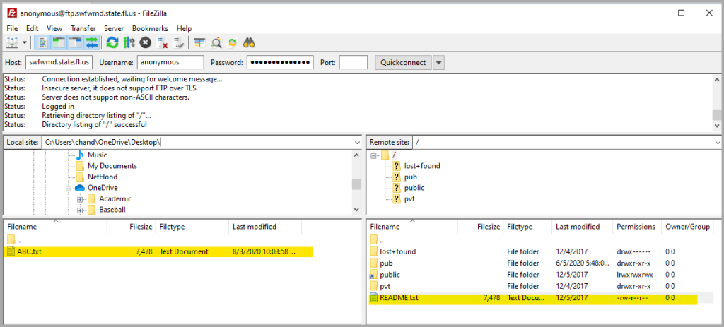 I have selected the downloaded file ABC.txt to upload. So the “Local File” location is unchanged. Select a compatible directory in the FTP server to store your data using FileZilla. I have selected a directory in the “/pub/incoming” folder. Verify your results as in the previous section.