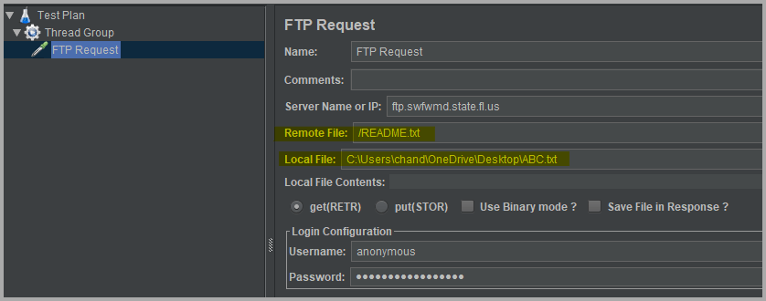 Paste it on the Remote File section in JMeter and remove the server address as it has mentioned in the Server name section. Then copy the destination location on your local computer from FileZilla and paste it on the Local File section in JMeter. Give a file name to save your file. I have given the title as ABC.txt.