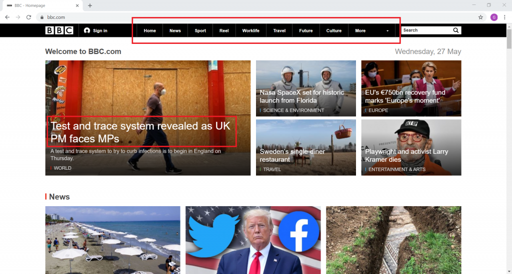 We will choose a dynamic website – “BBC News”, to explain this concept in a real scenario. We will use the findElement method to display the headlines of the webpage and we will use findElements methods to display the menu items.