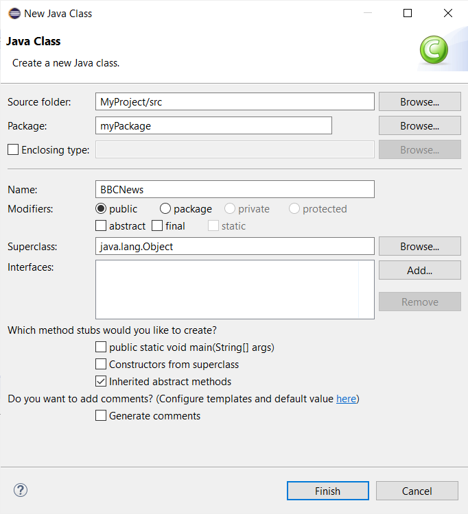 Now let’s program to demonstrate the above concept using Java language. First, open the Eclipse IDE and create a new class and name it as BBCNews.
