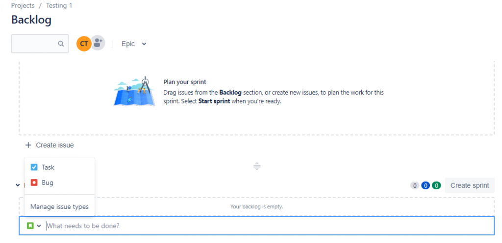 You can see some settings on the left side.”Roadmap” is called as the timeline of your project. It helps to see the progress of your project. You can create issues of your project using the backlog section. There are three types of issues called bugs, tasks, and Story.