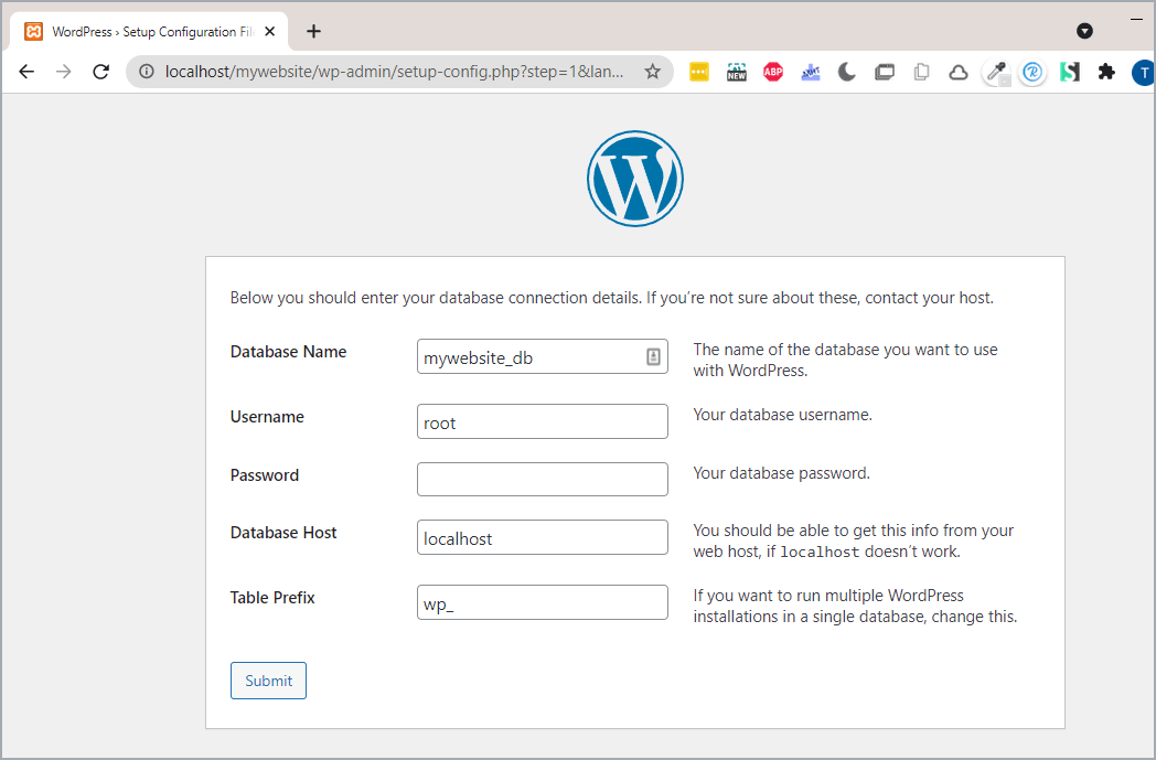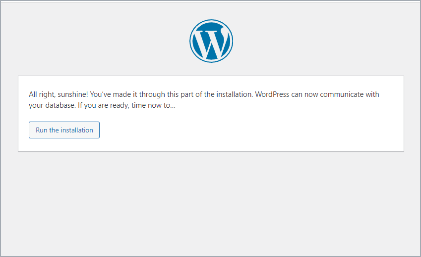 Once everything is done, click on “Submit” and you’ll be taken to the WordPress installation page. Just run the installation