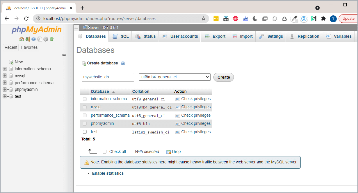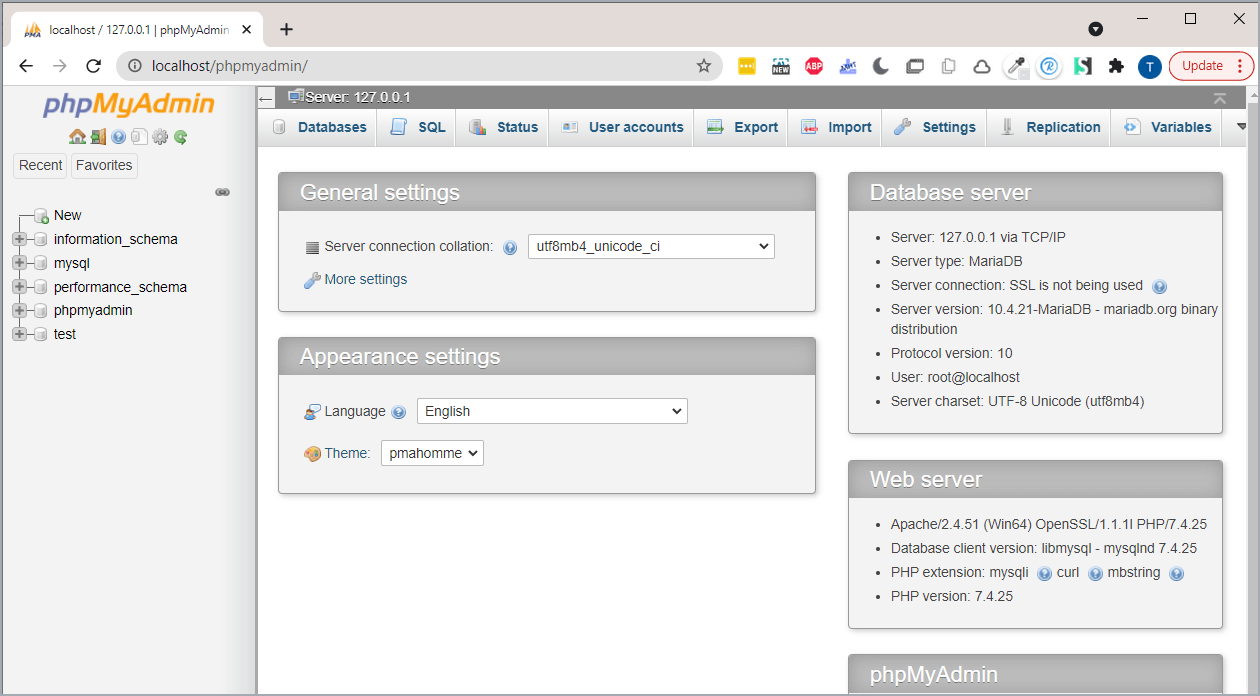 Open a new browser tab and type the following URL to launch PHPMyAdmin, http://localhost/phpmyadmin/ . This should launch the following web interface