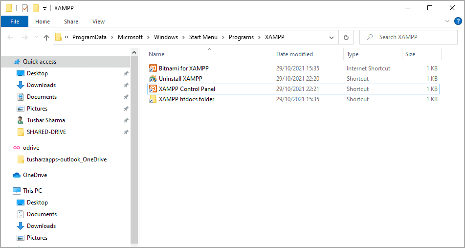 Navigate to the shortcut for launching the XAMPP. On Win10 the location for XAMPP shortcut is usually this – C:\ProgramData\Microsoft\Windows\Start Menu\Programs\XAMPP