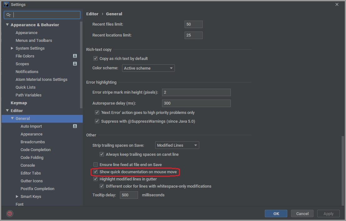 While on settings dialog box again navigate to [Editor | General] and enable the option ‘Show quick documentation on mouse move’. Click ‘Apply’ and ‘OK’.