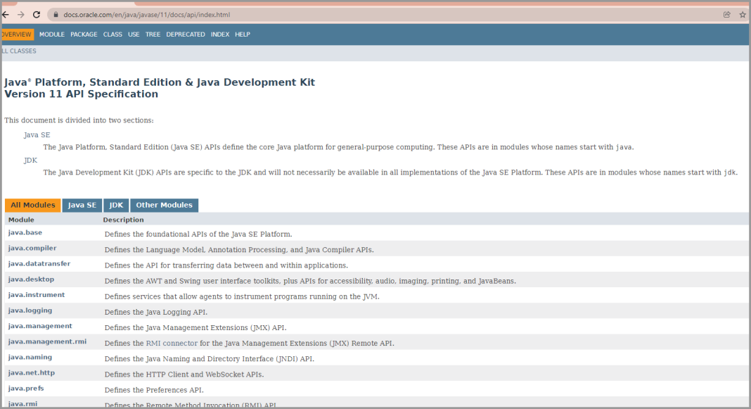 Locate the URL for your JavaDoc online. For example, the URL for Java 11 Java API Doc is – https://docs.oracle.com/en/java/javase/11/docs/api/index.html