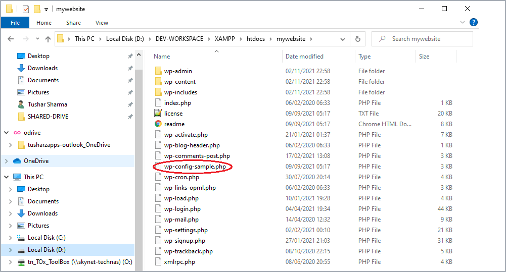 Navigate to the WordPress project folder and locate the sample configuration file with the name ‘wp-config-sample.php’.