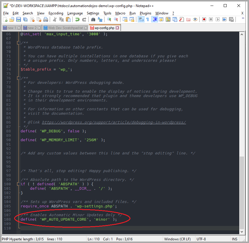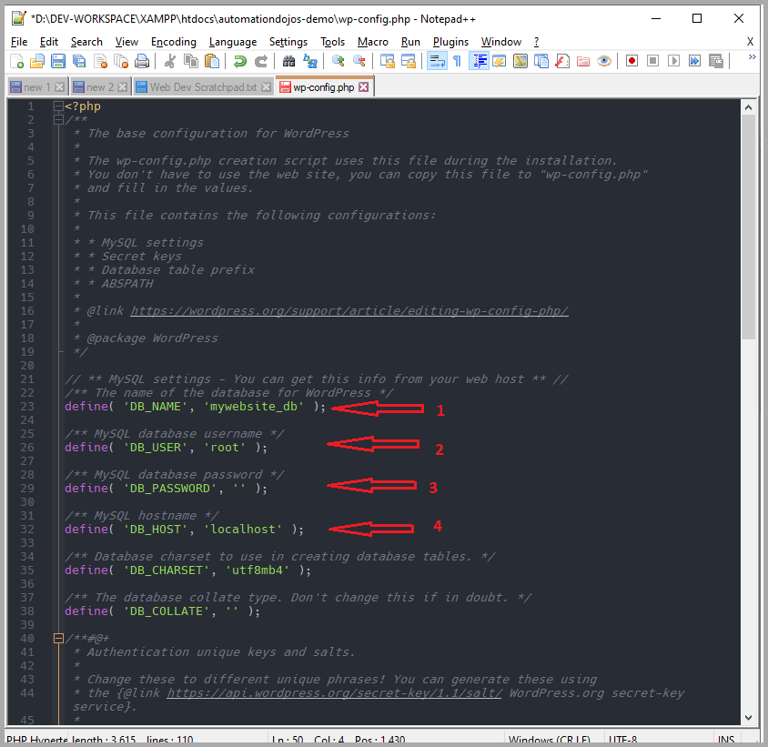 So let us add the above parameter and values in our ‘wp-config.php’ file. You can add these lines towards the end of your configuration file as shown in the screenshot.