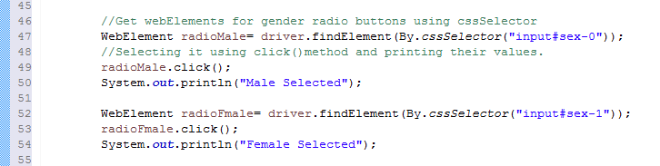 WebElement radioMale=driver.findElement(By.cssSelector("input#sex-0"));