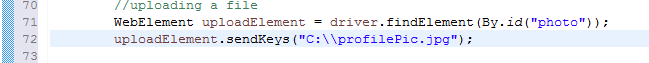 However here is one such, simple implementation for File uploading. In the below snippet ‘File Uploading’ is simply done by locating the file-select input field and by entering the path of the file to be uploaded using the sendKeys() method.